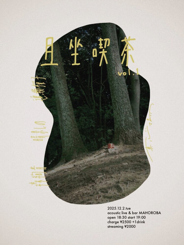 森絢音 pre. 「且坐喫茶vol.1」(生音ライブ) SCHEDULE 2025/12/02(火) LIVE&BAR 真心場 - M A H O R O B A - 地図を表示 OPEN 18:30 / START 19:00 遥瀬桜子 / 森絢音 / 晴景しの TICKET ¥2,500(+1D) チケットご予約(お取り置き) URLをコピーする 報告する